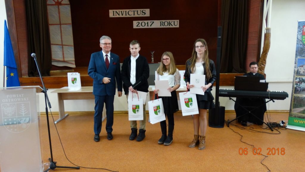 Ogłoszony przez Starostę Ostrowskiego Zbigniewa Kamińskiego Konkurs Literacki pn. "INVICTUS 2017 ROKU" został rozstrzygnięty 5 lutego br. w budynku Liceum Ogólnokształcącego im. Mikołaja Kopernika w Ostrowi Mazowieckiej, gdzie odbyła się uroczysta gala wręczenia statuetki i tytułu "INVICTUSA 2017 ROKU".