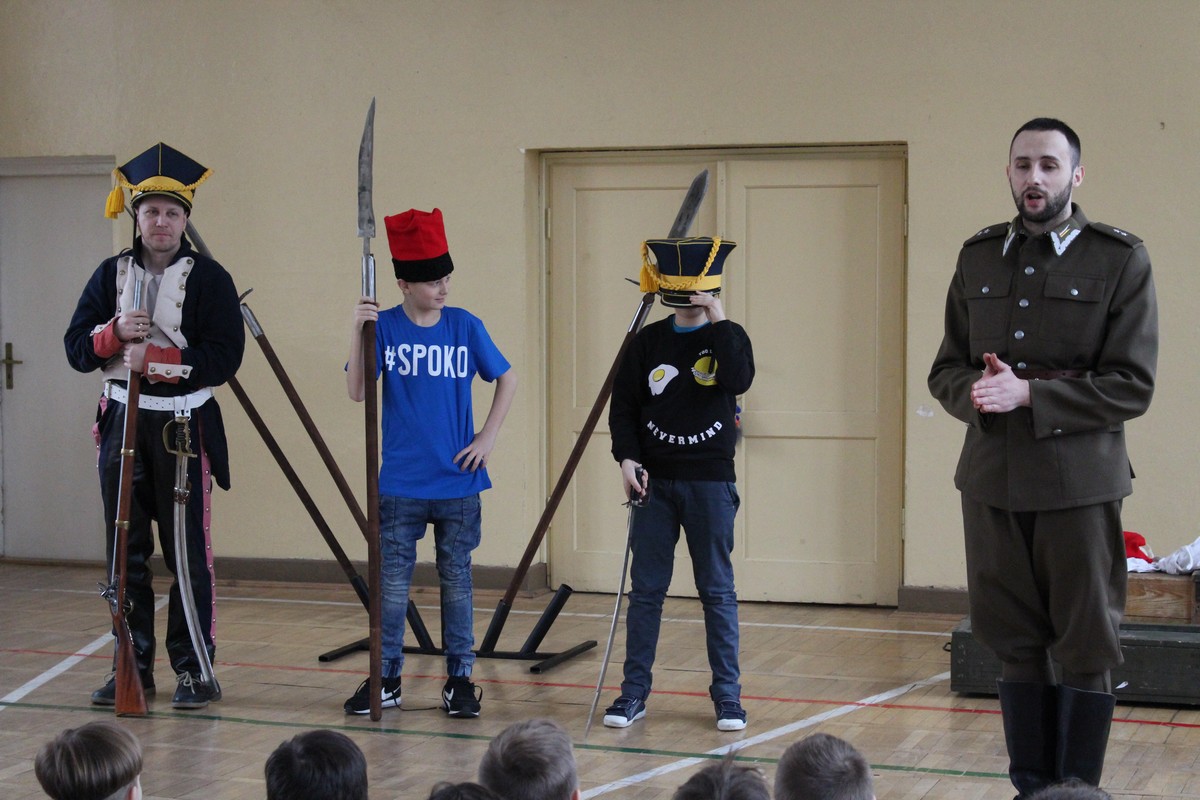 Grupa artystyczna "Rekonstrukto" zaprosiła uczniów kl. VIIB, VA, IVB, IVE, IIIA, IIA na pokaz historyczny "Ku niepodległej".