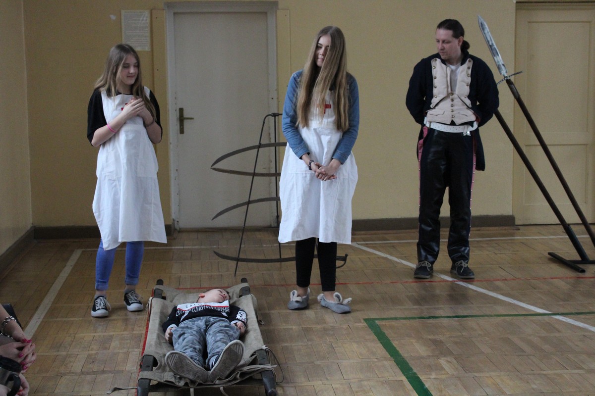 Grupa artystyczna "Rekonstrukto" zaprosiła uczniów kl. VIIB, VA, IVB, IVE, IIIA, IIA na pokaz historyczny "Ku niepodległej".