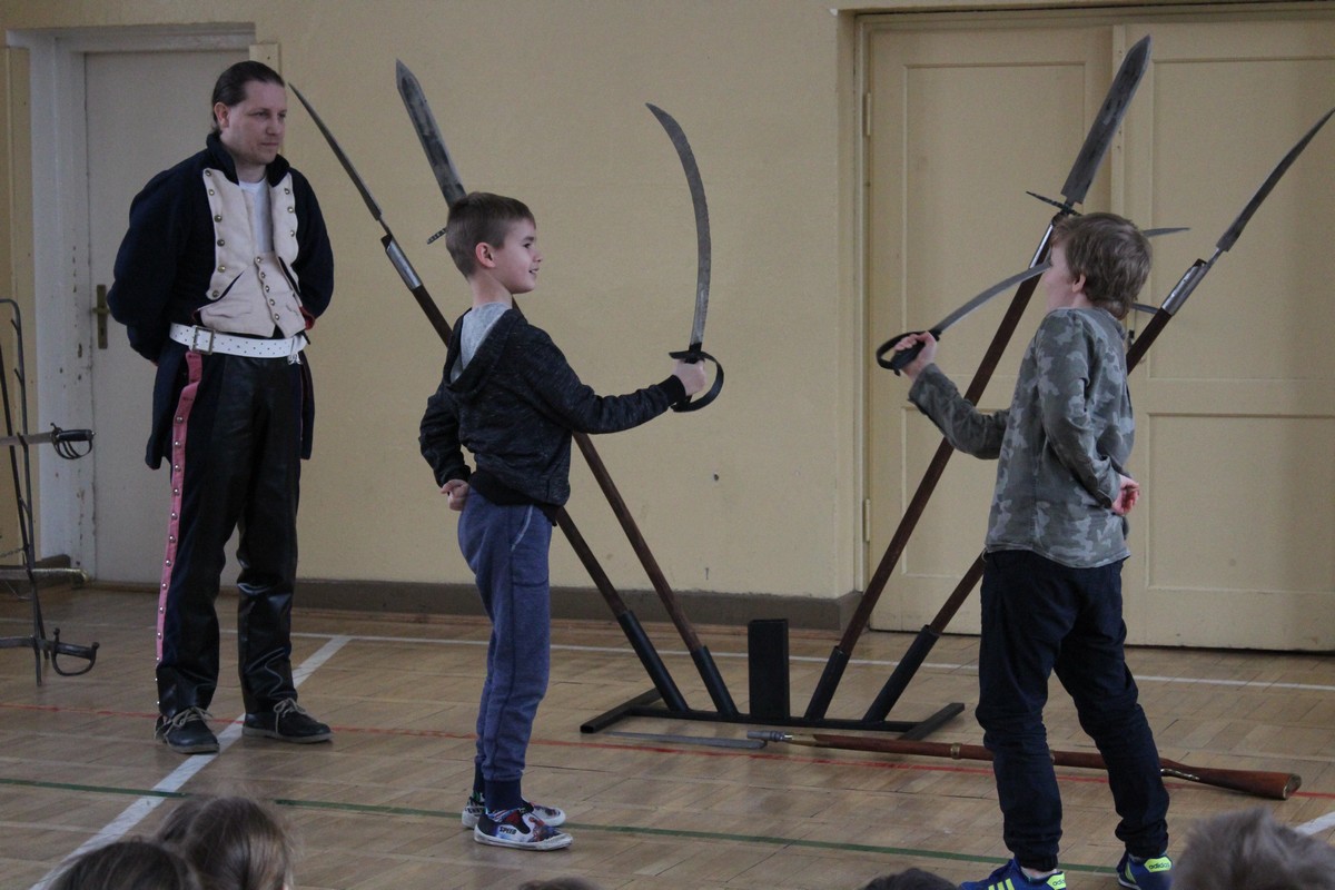 Grupa artystyczna "Rekonstrukto" zaprosiła uczniów kl. VIIB, VA, IVB, IVE, IIIA, IIA na pokaz historyczny "Ku niepodległej".