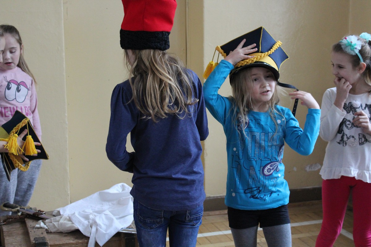 Grupa artystyczna "Rekonstrukto" zaprosiła uczniów kl. VIIB, VA, IVB, IVE, IIIA, IIA na pokaz historyczny "Ku niepodległej".