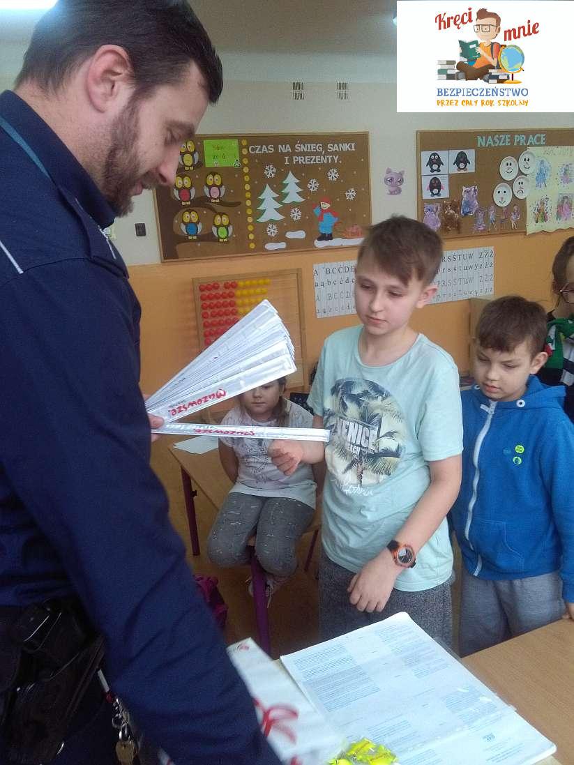 12 lutego uczniów szkoły w Trynosach - Osiedle odwiedził dzielnicowy asp. Marek Kaczmarczyk.
