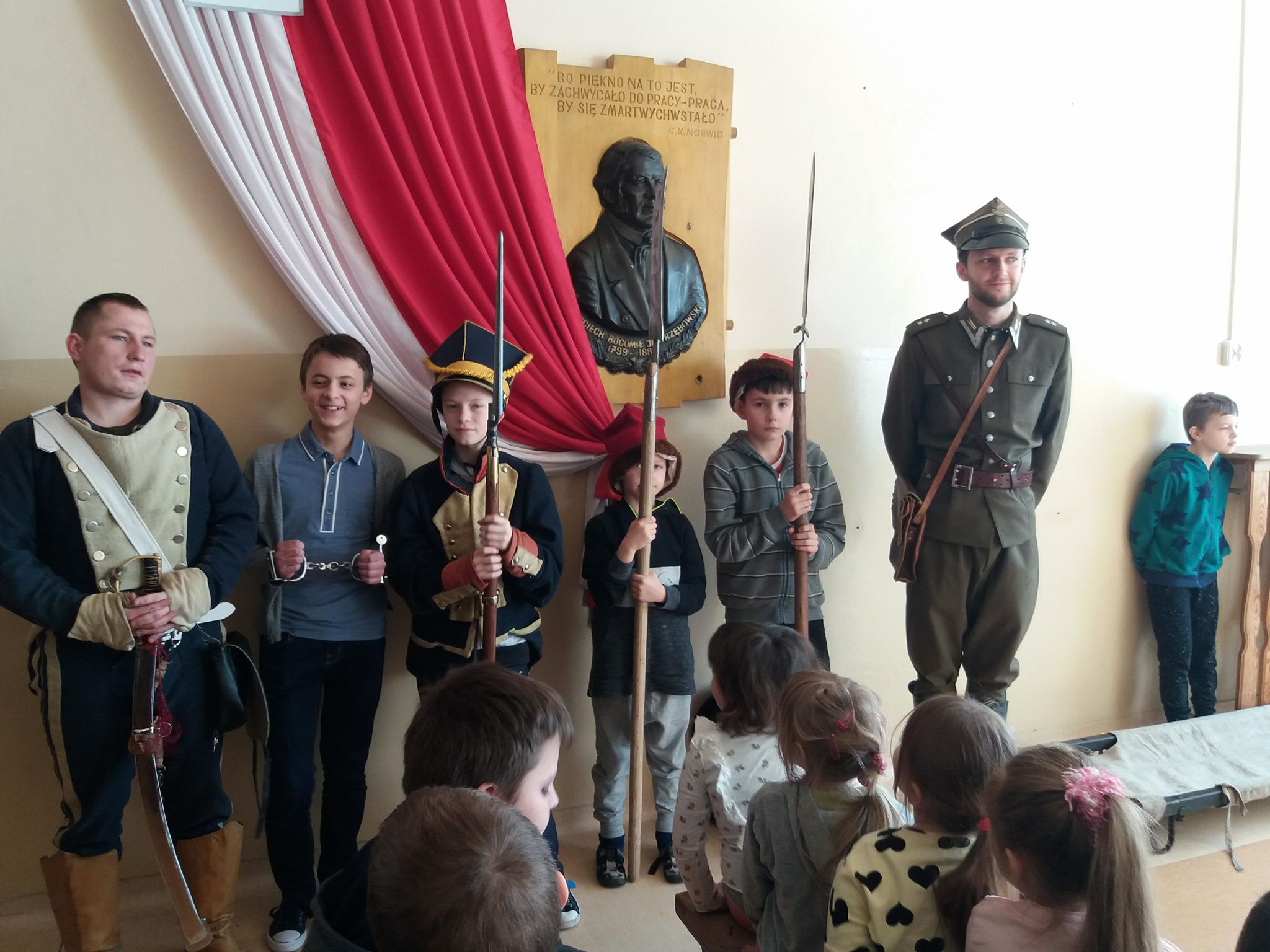 Uczniowie mieli okazję zobaczyć i przymierzyć stroje z okresu powstań narodowych oraz przyjrzeć się broni używanej w czasie walki o niepodległość Polski.