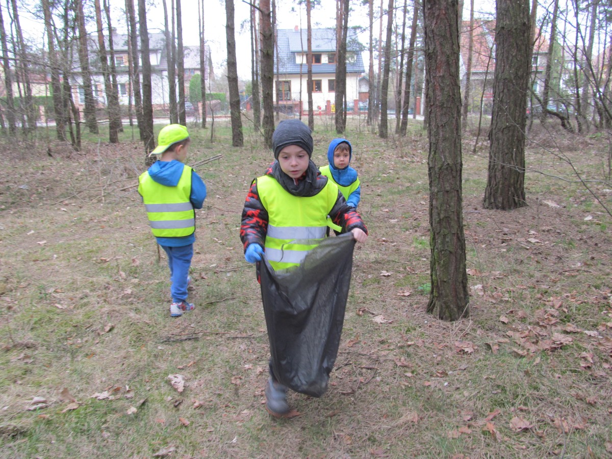 Przedszkolaki udali się do pobliskiego lasu aby go uporządkować, oczywiście zaopatrzyli się w niezbędne akcesoria typu gumowe rękawiczki i worki na śmieci.