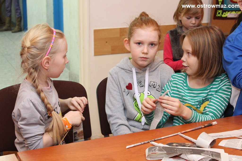 Czwartego dnia ferii dzieci wraz z Miejskim Domem Kultury czytały wspólnie baśnie braci Grimm oraz majstrowały przy wiklinach z papieru.