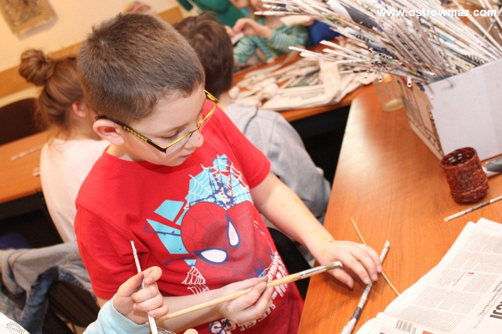 Czwartego dnia ferii dzieci wraz z Miejskim Domem Kultury czytały wspólnie baśnie braci Grimm oraz majstrowały przy wiklinach z papieru.