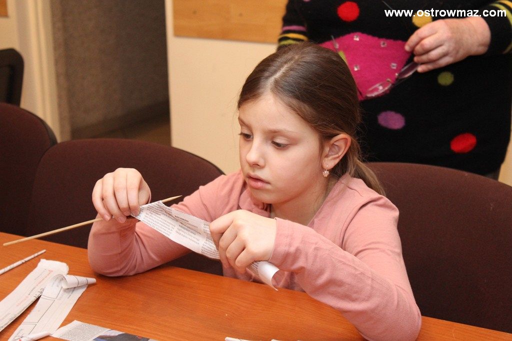 Czwartego dnia ferii dzieci wraz z Miejskim Domem Kultury czytały wspólnie baśnie braci Grimm oraz majstrowały przy wiklinach z papieru.