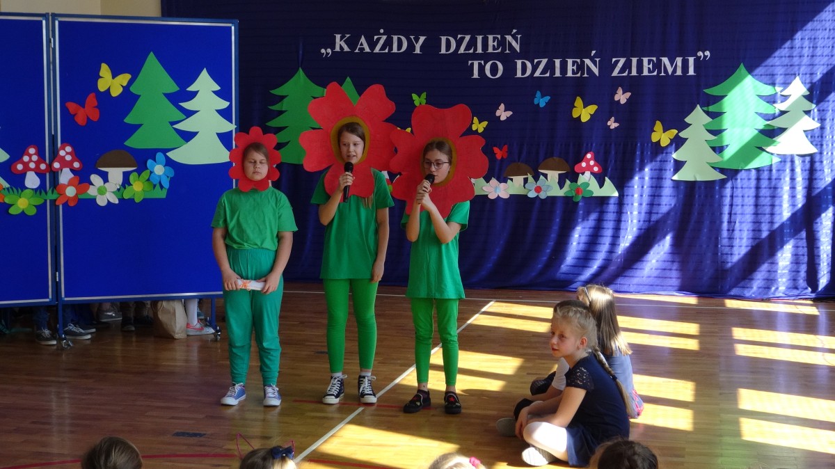 Uczniowie przedstawili montaż słowno-muzyczny pt. "Kłopoty leśnego krasnala". Przesłaniem przedstawienia było to, aby dbać o nasza planetę.
