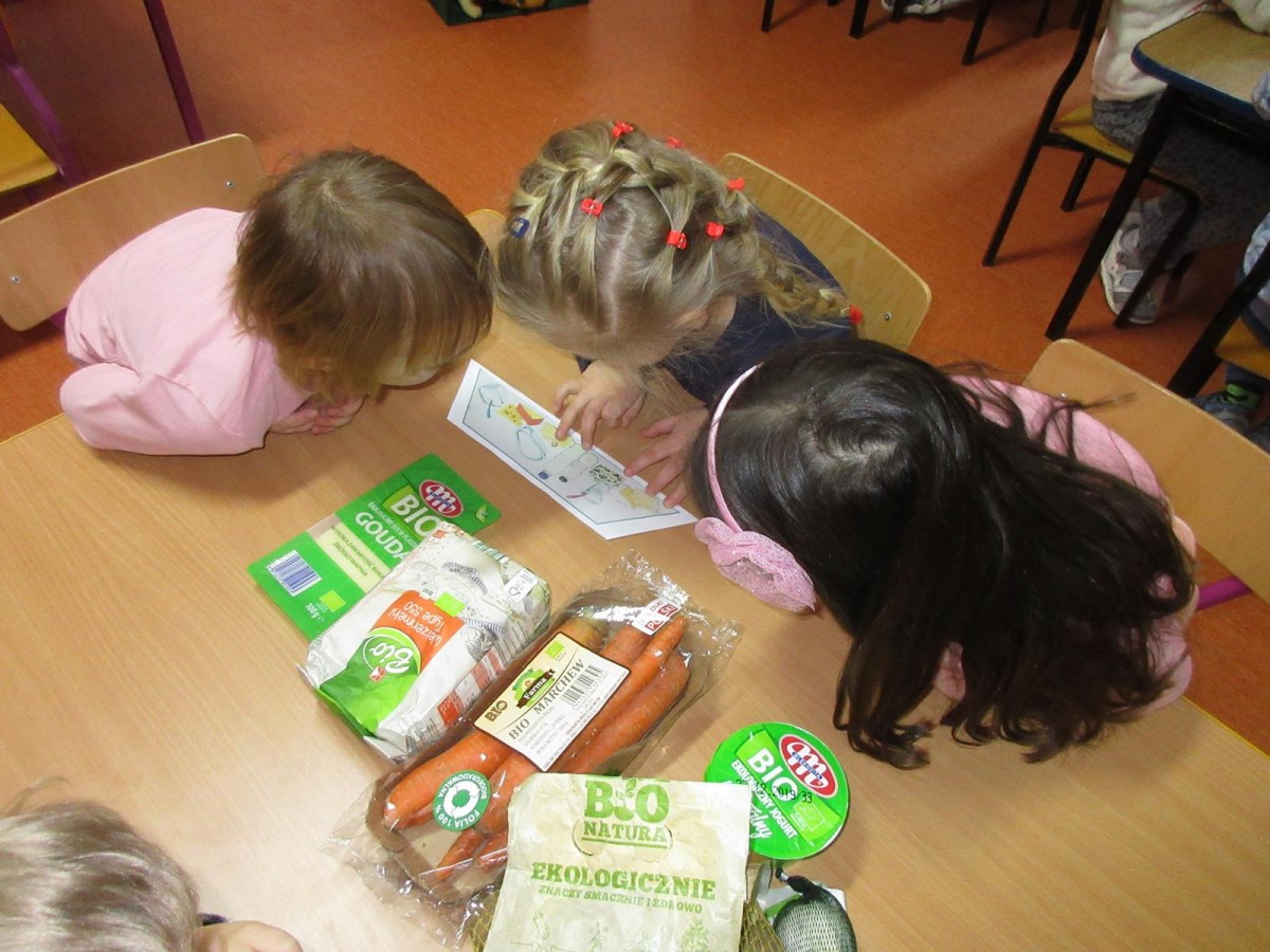 Podczas lekcji dzieci poznały znaczek rolnictwa ekologicznego i dowiedziały się, czym są produkty ekologiczne.
