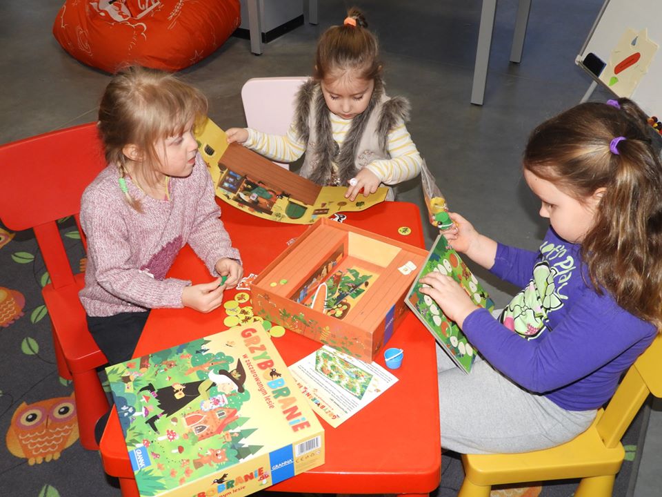 Pracownicy biblioteki zachęcają do wzięcia udziału we wspólnej zabawie.