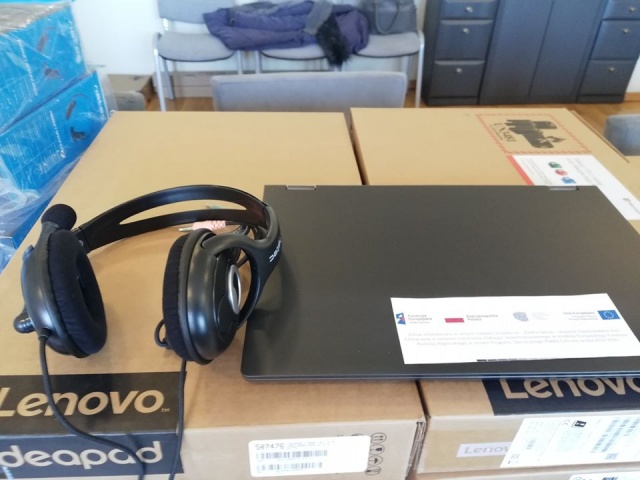 Dzięki pozyskanemu dofinansowaniu zakupiono niezbędny sprzęt do realizacji nauczania zdalnego, m.in.: 24 laptopy, myszki oraz zestawy słuchawek z mikrofonami.