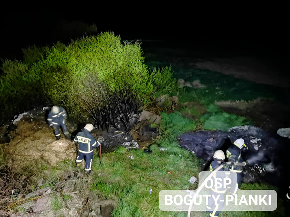 Pożarem były objęte śmieci, sterta folii, opon i pobliskie krzaki.