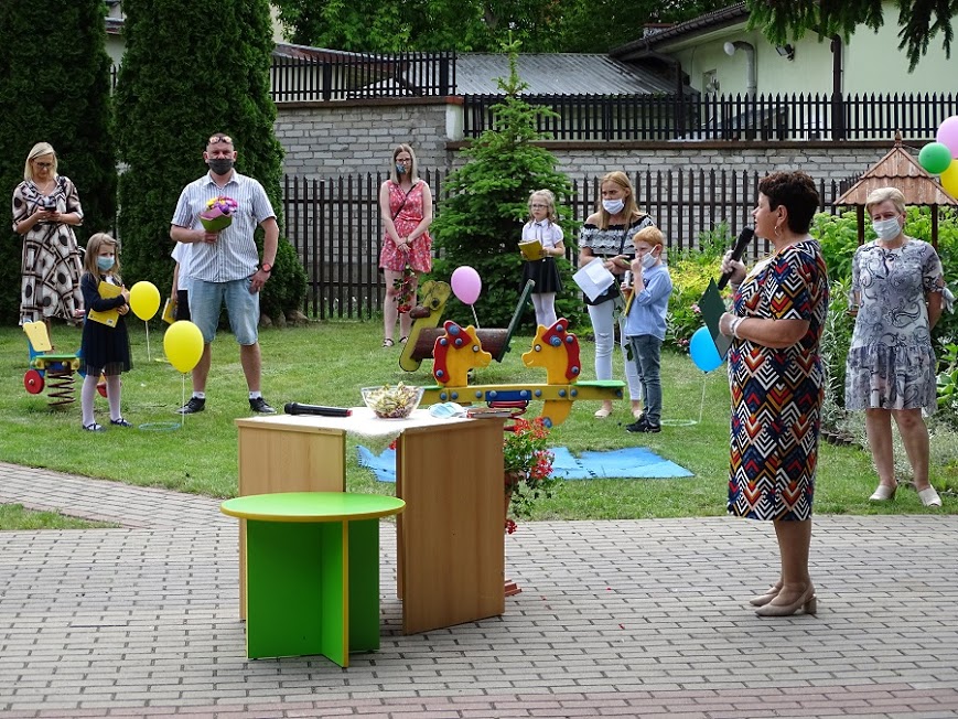 Dyrektor Małgorzata Zalewska powitała dzieci i rodziców, podsumowała lata, które dzieci spędziły w przedszkolu a także podziękowała rodzicom za współpracę.