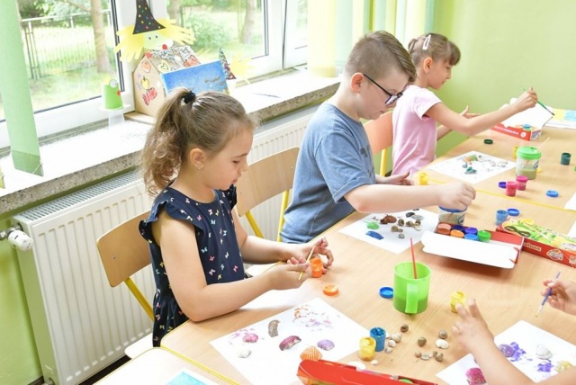 Kolejny dzień wakacyjnych zajęć obfitował w morskie pejzaże. Przy użyciu muszelek, farb i piasku wykonano piękne krajobrazy morskie.