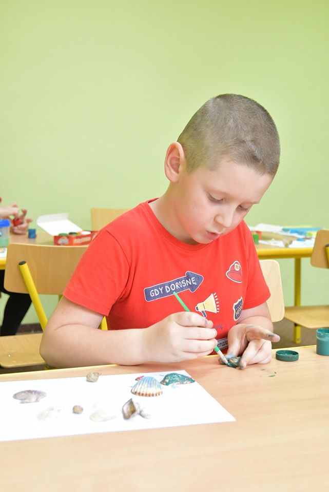 Kolejny dzień wakacyjnych zajęć obfitował w morskie pejzaże. Przy użyciu muszelek, farb i piasku wykonano piękne krajobrazy morskie.