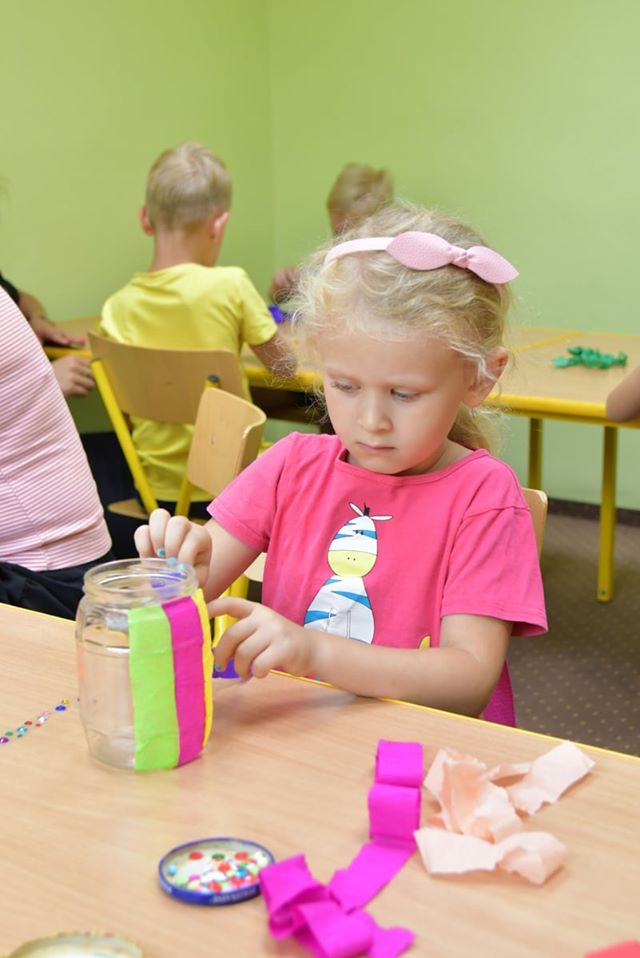 W ostatnim tygodniu wspólnych zabaw w bibliotece tworzono barwne lampiony, wykorzystując do tego słoiki, kolorową bibułę, tasiemki oraz błyszczące cekiny.