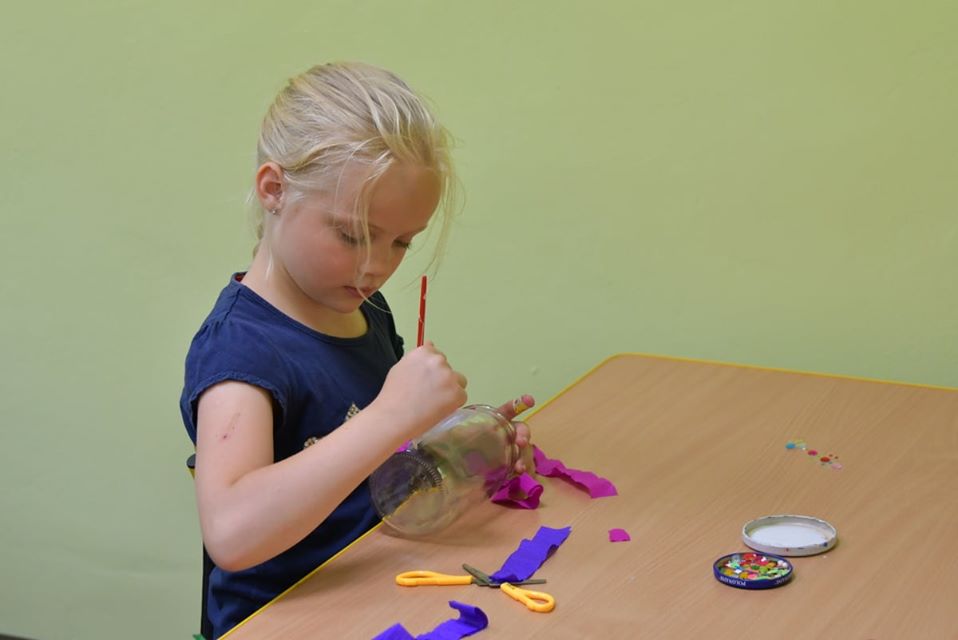 W ostatnim tygodniu wspólnych zabaw w bibliotece tworzono barwne lampiony, wykorzystując do tego słoiki, kolorową bibułę, tasiemki oraz błyszczące cekiny.