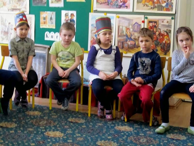 Pani Marysia opowiedziała dzieciom o tradycjach kurpiowskich, o tym skąd wzięła się nazwa Kurpie, jak nazywają się elementy stroju regionalnego.