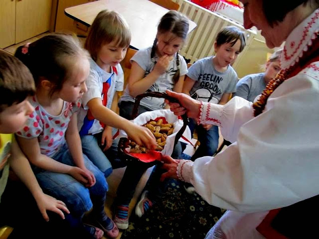 Pani Marysia opowiedziała dzieciom o tradycjach kurpiowskich, o tym skąd wzięła się nazwa Kurpie, jak nazywają się elementy stroju regionalnego.