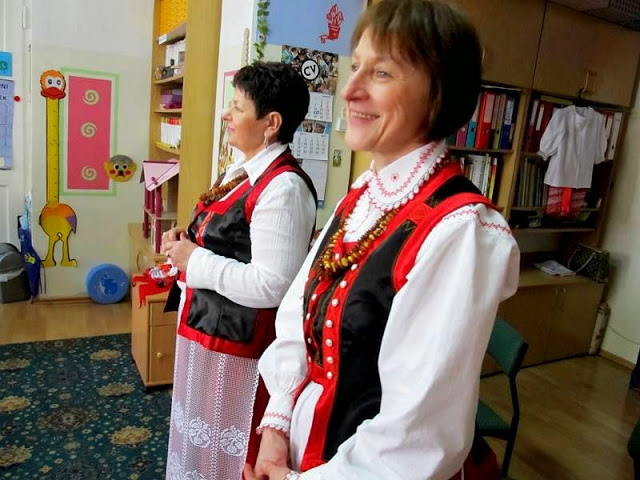 Pani Marysia opowiedziała dzieciom o tradycjach kurpiowskich, o tym skąd wzięła się nazwa Kurpie, jak nazywają się elementy stroju regionalnego.