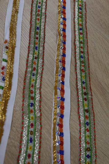 Efekt zajęć to wykonanie przez uczestniczki warsztatów długich taśm z wyhaftowanymi tradycyjnymi wzorami Kurpi Białych.