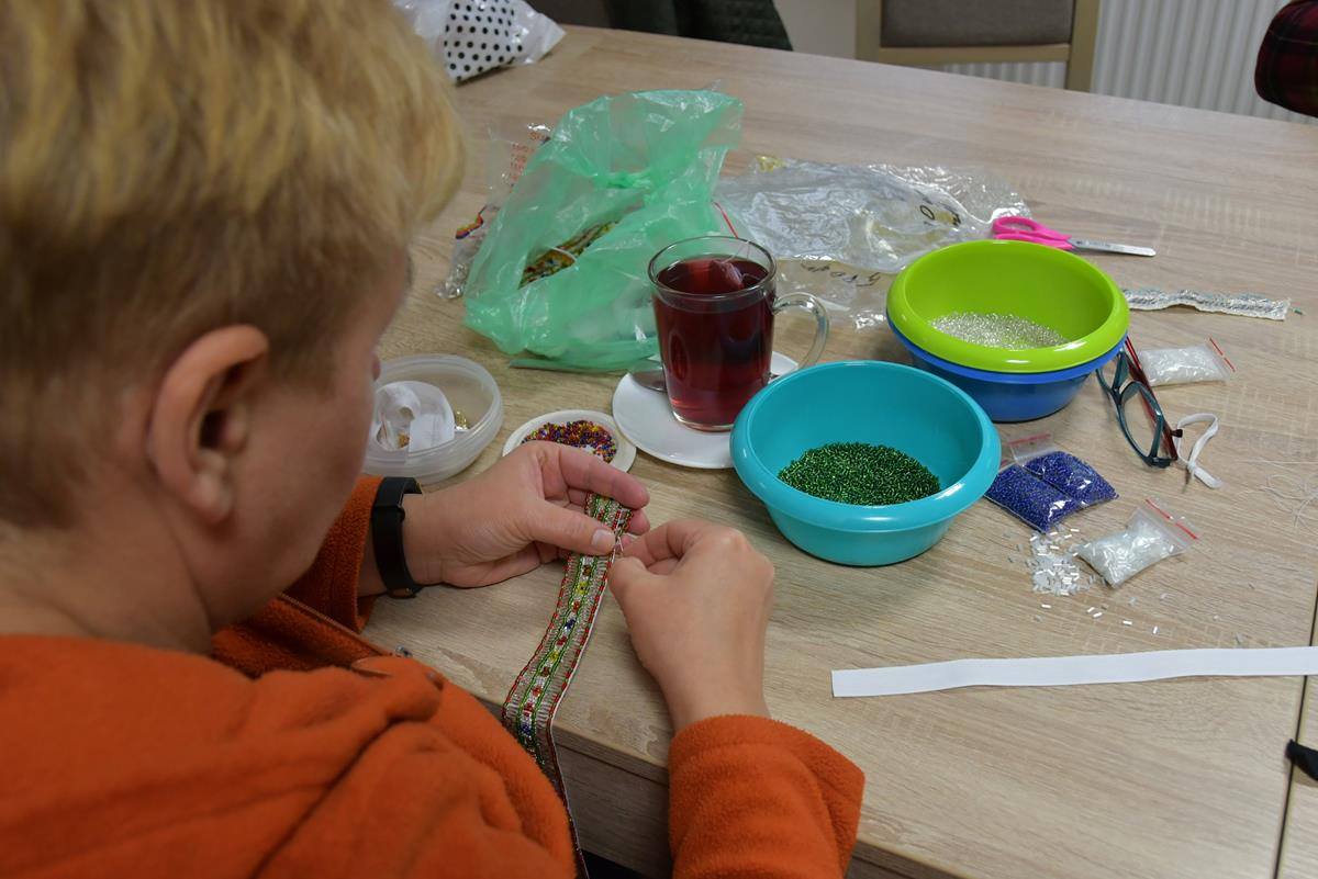 Efekt zajęć to wykonanie przez uczestniczki warsztatów długich taśm z wyhaftowanymi tradycyjnymi wzorami Kurpi Białych.