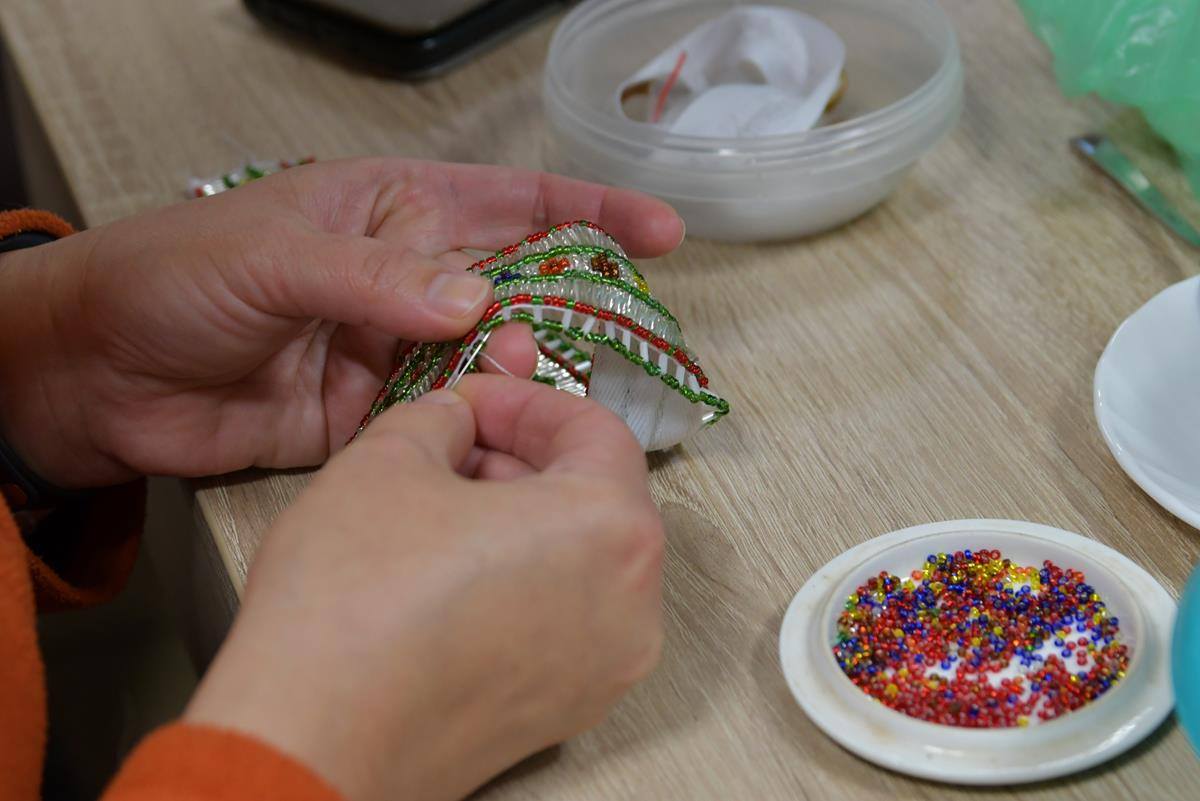 Efekt zajęć to wykonanie przez uczestniczki warsztatów długich taśm z wyhaftowanymi tradycyjnymi wzorami Kurpi Białych.
