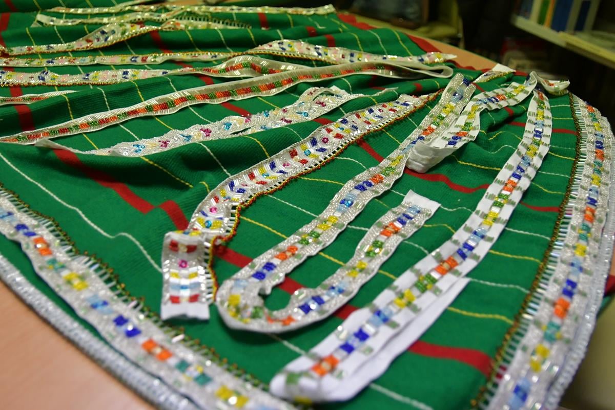 Efekt zajęć to wykonanie przez uczestniczki warsztatów długich taśm z wyhaftowanymi tradycyjnymi wzorami Kurpi Białych.