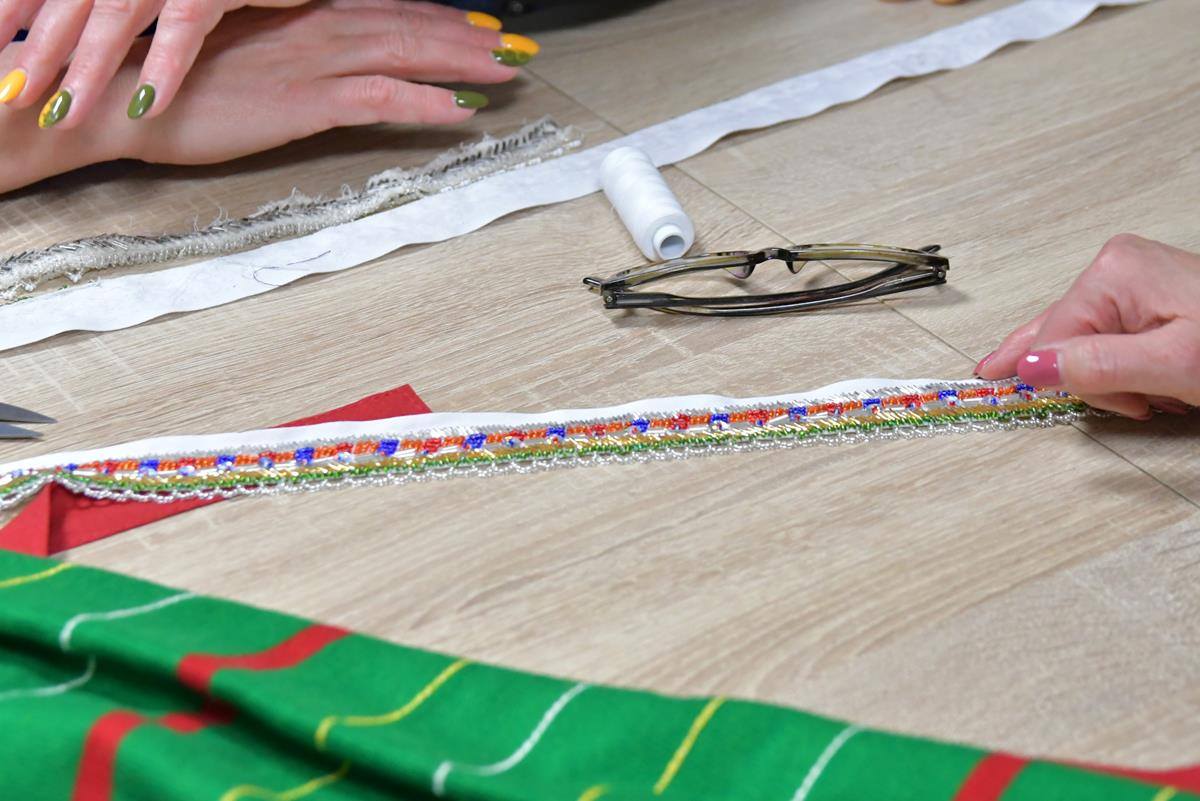 Efekt zajęć to wykonanie przez uczestniczki warsztatów długich taśm z wyhaftowanymi tradycyjnymi wzorami Kurpi Białych.