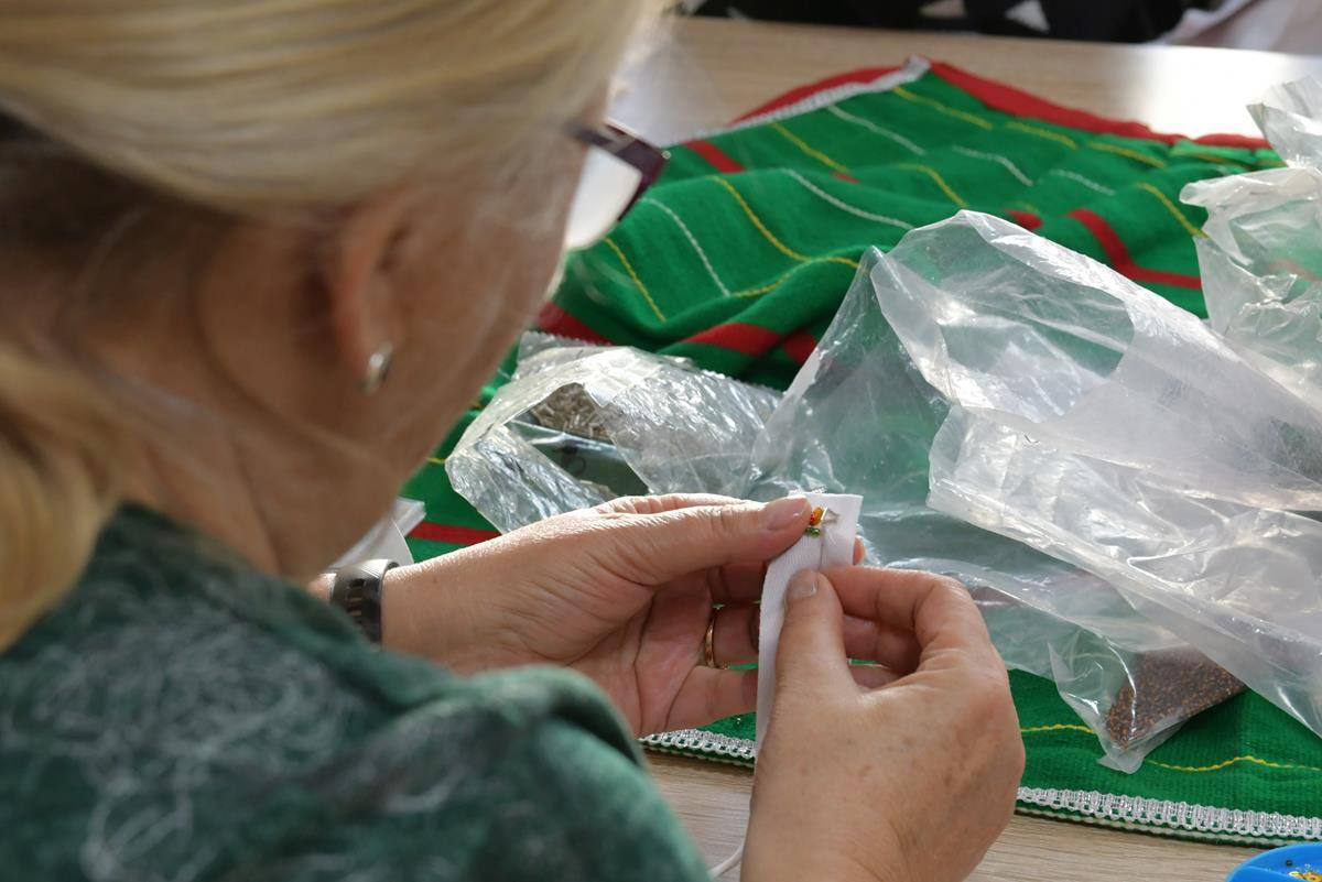 Efekt zajęć to wykonanie przez uczestniczki warsztatów długich taśm z wyhaftowanymi tradycyjnymi wzorami Kurpi Białych.