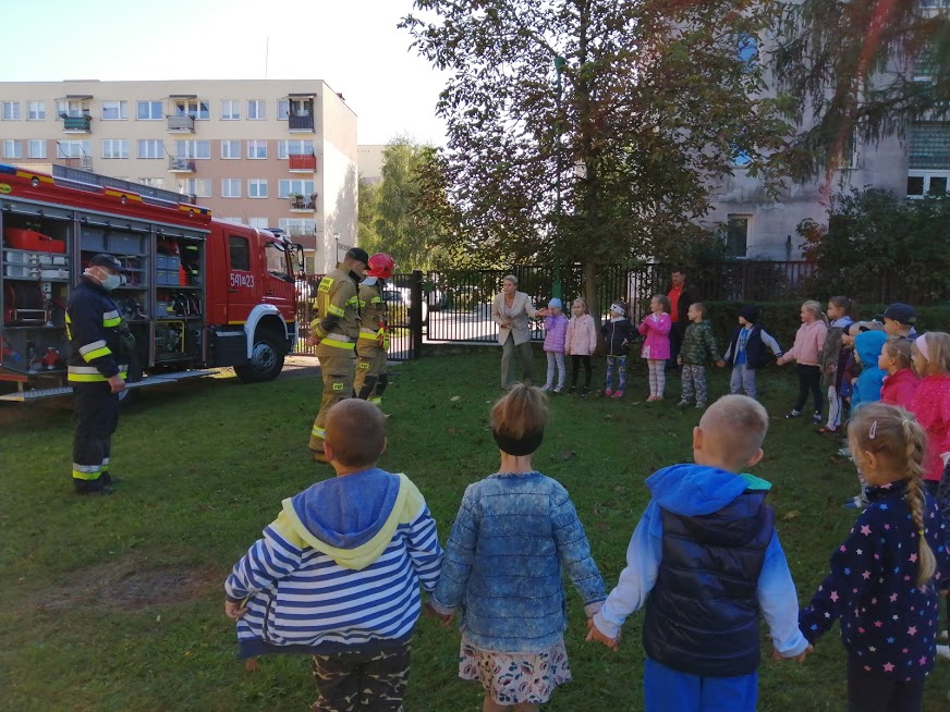 Z zachowaniem wszelkich środków ostrożności strażacy przeprowadzili z dziećmi krótką pogadankę.
