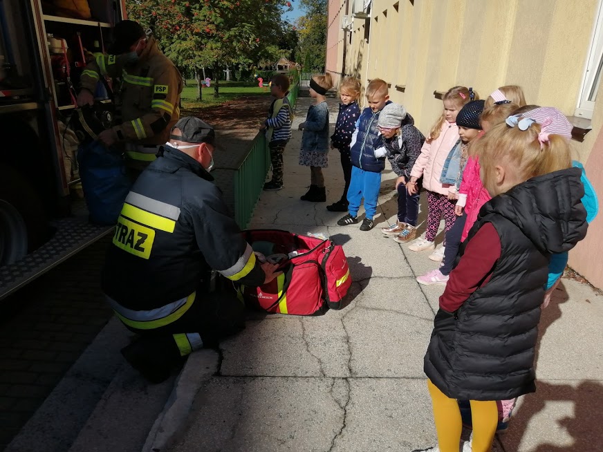 Z zachowaniem wszelkich środków ostrożności strażacy przeprowadzili z dziećmi krótką pogadankę.