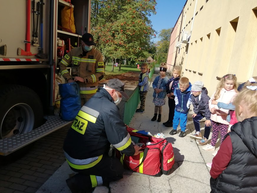 Z zachowaniem wszelkich środków ostrożności strażacy przeprowadzili z dziećmi krótką pogadankę.