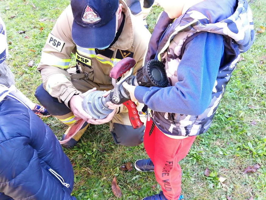 Z zachowaniem wszelkich środków ostrożności strażacy przeprowadzili z dziećmi krótką pogadankę.
