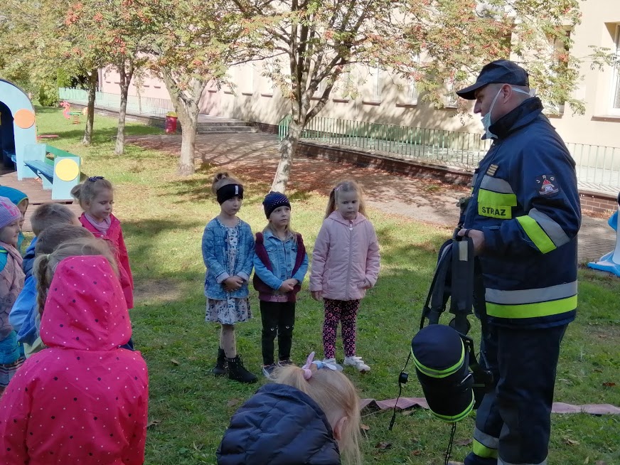 Z zachowaniem wszelkich środków ostrożności strażacy przeprowadzili z dziećmi krótką pogadankę.