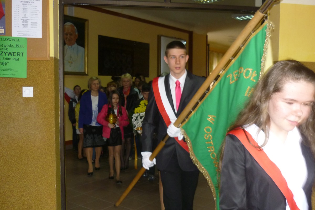 28 kwietnia 2014r. młodzież, nauczyciele i dyrekcja ostrowskiej "Dwójki" przed pomnikiem papieża oddała hołd swojemu patronowi, Świętemu Janowi Pawłowi II.