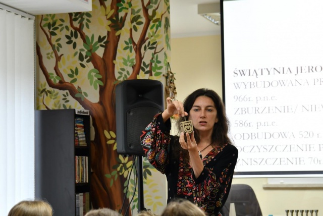 Renata Płotczyk przybliżyła uczniom kulturę i zwyczaje żydowskie.