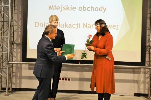 Miejskie obchody Dnia Edukacji Narodowej rozpoczął krótki koncert instrumentalno-wokalny w wykonaniu Kameralnego Zespołu Instrumentalnego oraz wokalistek Ostrowskiego Studia Piosenki.