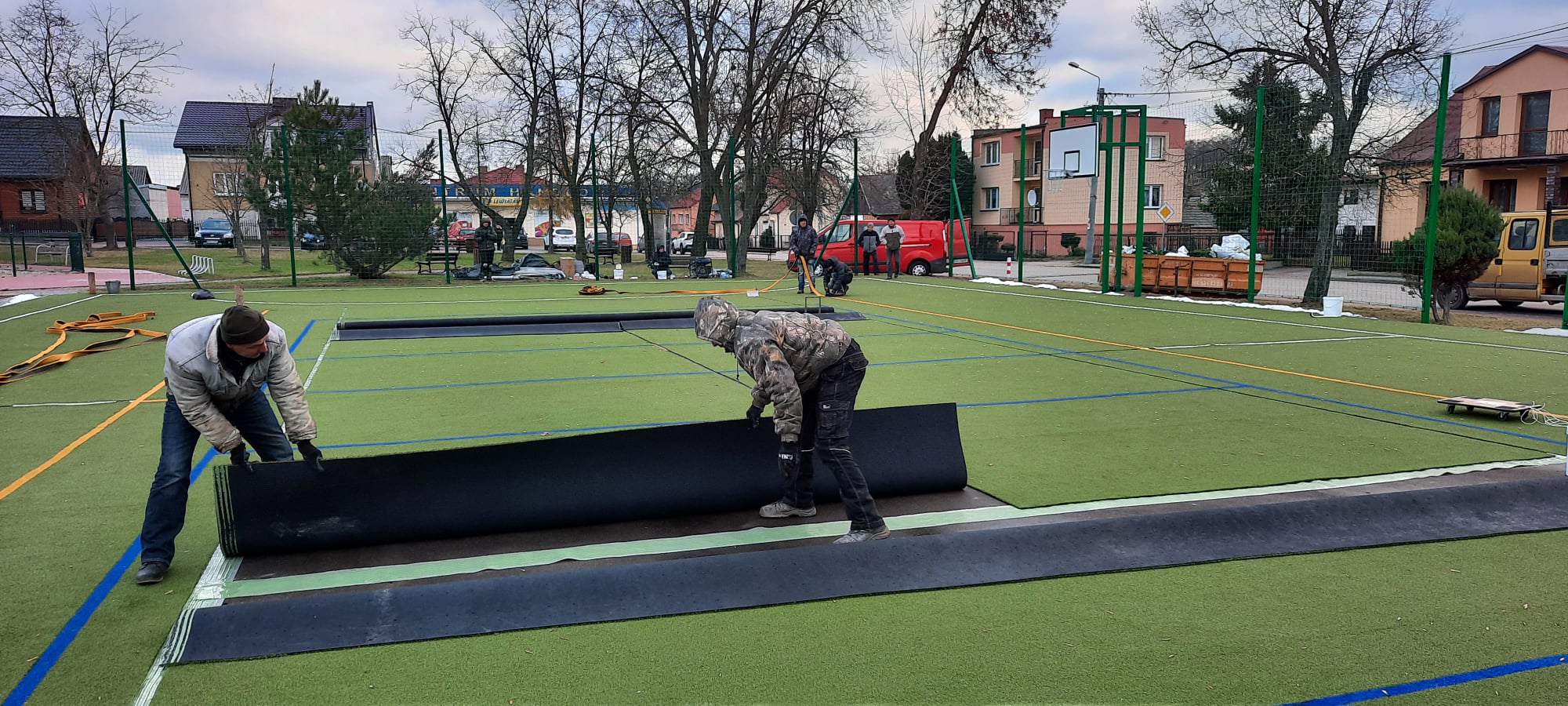 Prace polegają na wymianie starej zniszczonej nawierzchni, wykonaniu nowej podbudowy z betonu jamistego i nowej nawierzchni ze sztucznej trawy.