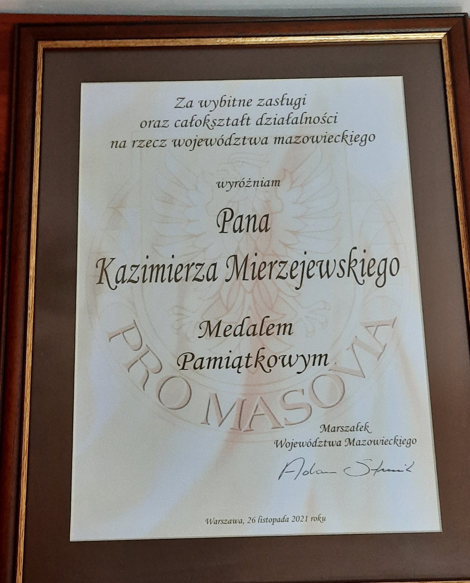 26 listopada 2021 r. w sali konferencyjnej Urzędu Gminy w Andrzejewie odbyła się XXVI sesja Rady Gminy Andrzejewo, podczas której miała miejsce ceremonia wręczenia pamiątkowego medalu Pro-Masovia druhowi Kazimierzowi Mierzejewskiemu.
