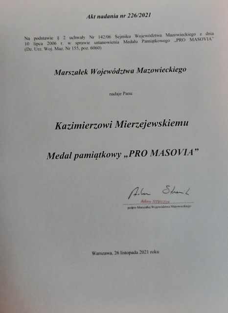 26 listopada 2021 r. w sali konferencyjnej Urzędu Gminy w Andrzejewie odbyła się XXVI sesja Rady Gminy Andrzejewo, podczas której miała miejsce ceremonia wręczenia pamiątkowego medalu Pro-Masovia druhowi Kazimierzowi Mierzejewskiemu.