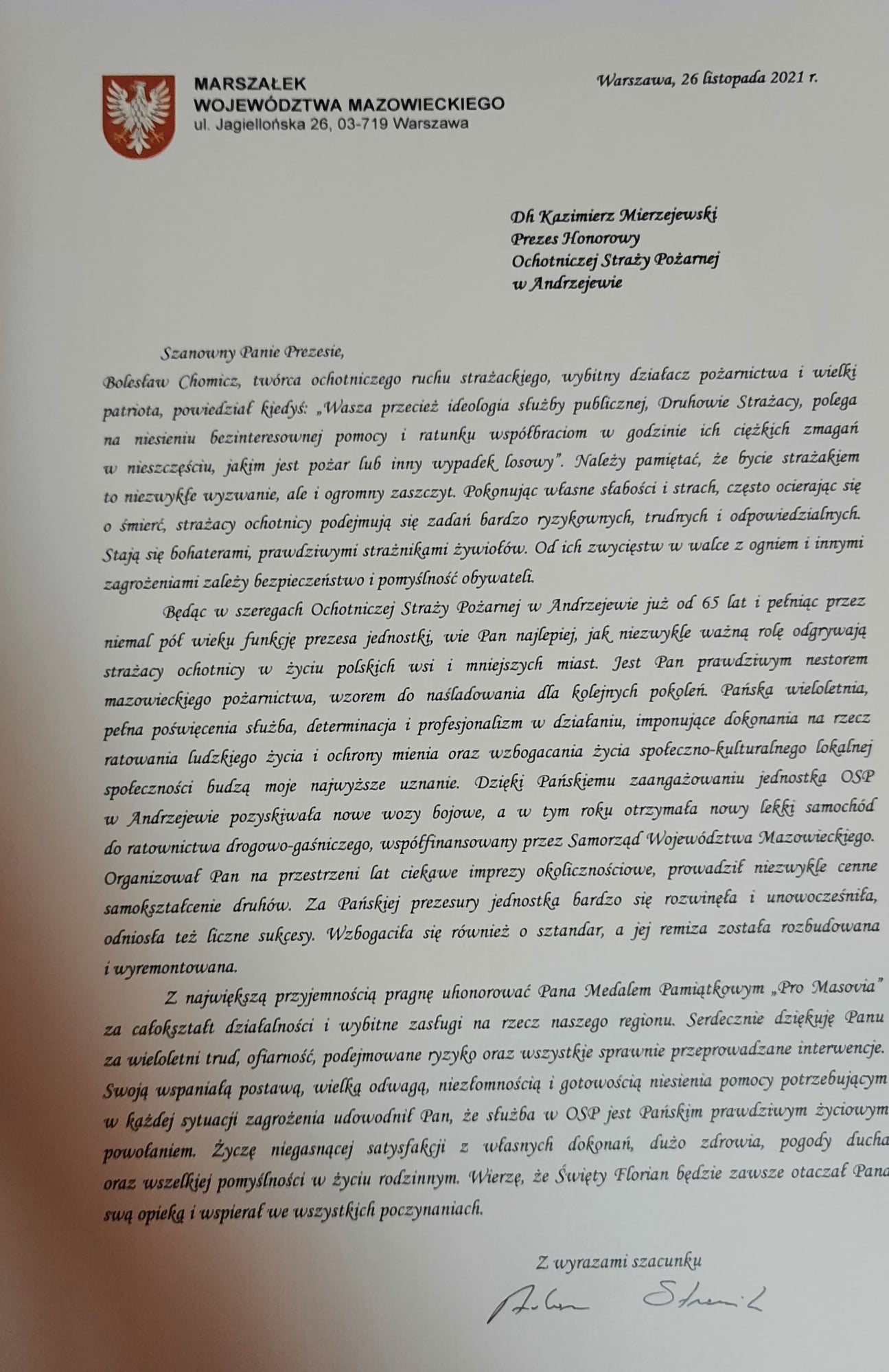 26 listopada 2021 r. w sali konferencyjnej Urzędu Gminy w Andrzejewie odbyła się XXVI sesja Rady Gminy Andrzejewo, podczas której miała miejsce ceremonia wręczenia pamiątkowego medalu Pro-Masovia druhowi Kazimierzowi Mierzejewskiemu.