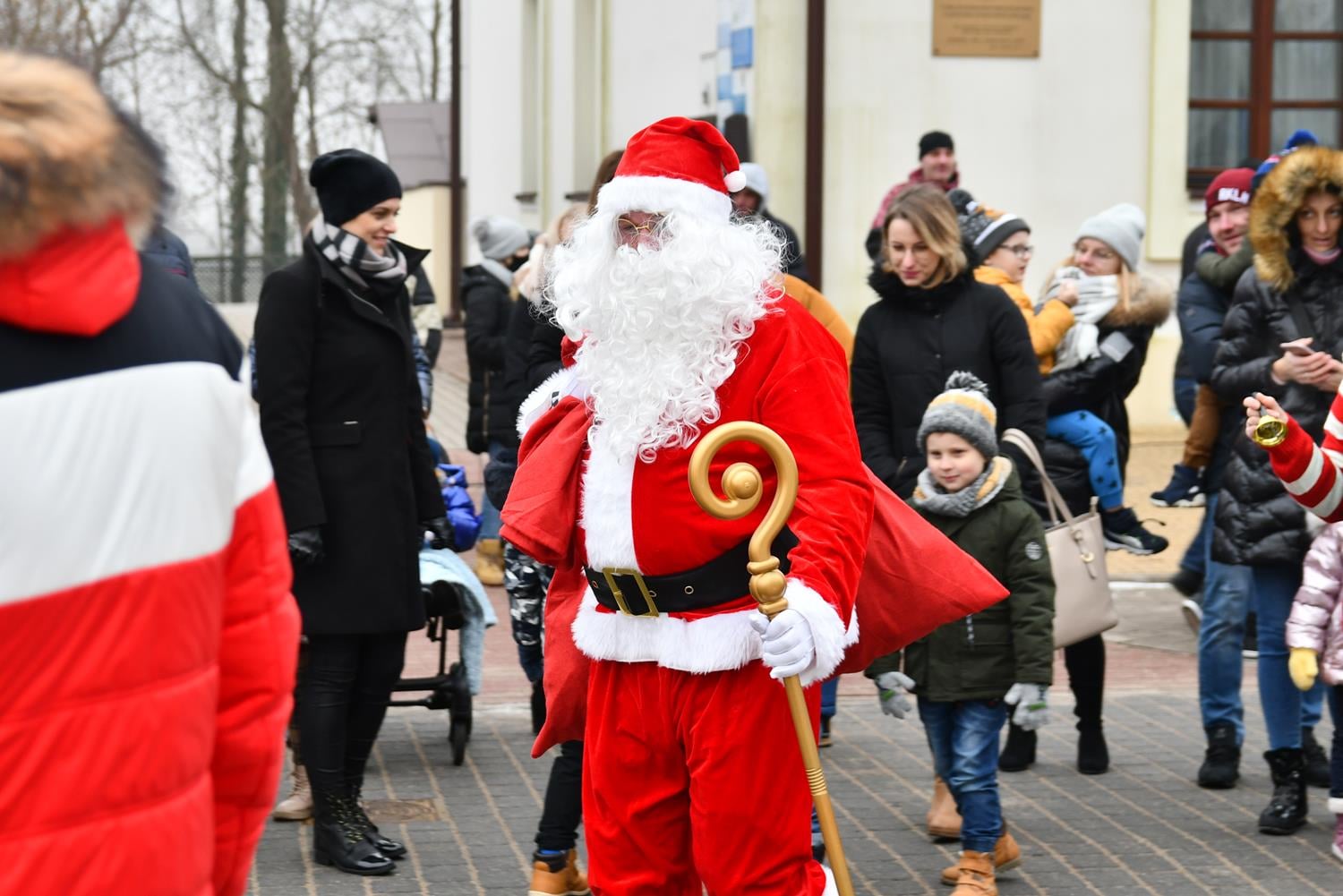 Przed przybyciem św. Mikołaja na placu przed ratuszem na choinkach rozbłysły lampki, a z głośników popłynęła świąteczna muzyka.
