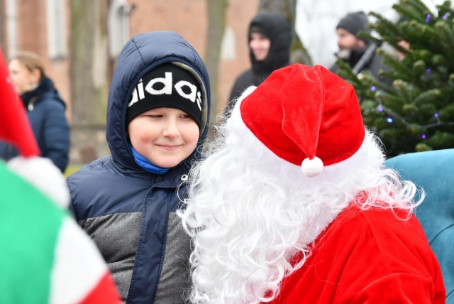 Przed przybyciem św. Mikołaja na placu przed ratuszem na choinkach rozbłysły lampki, a z głośników popłynęła świąteczna muzyka.