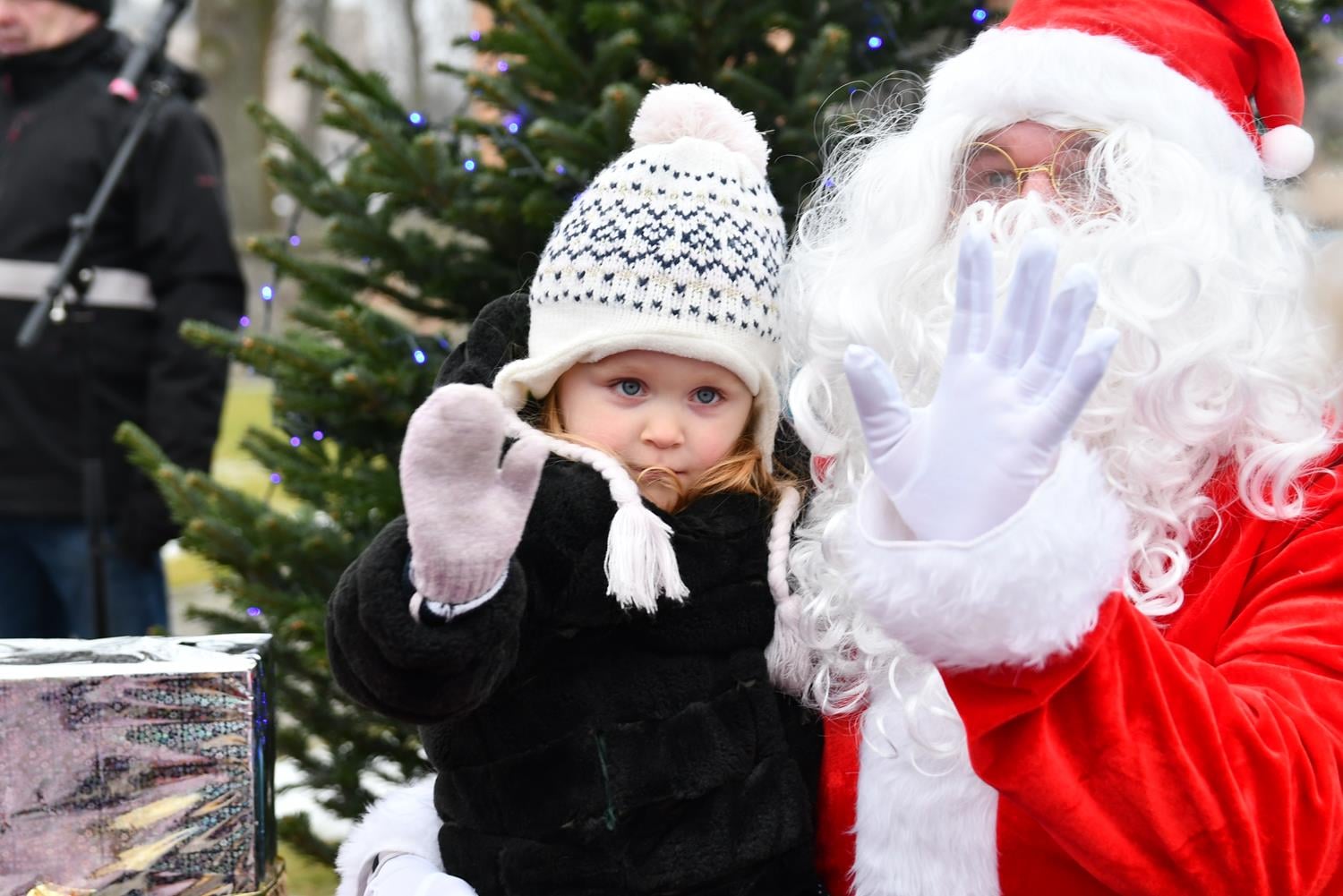 Przed przybyciem św. Mikołaja na placu przed ratuszem na choinkach rozbłysły lampki, a z głośników popłynęła świąteczna muzyka.