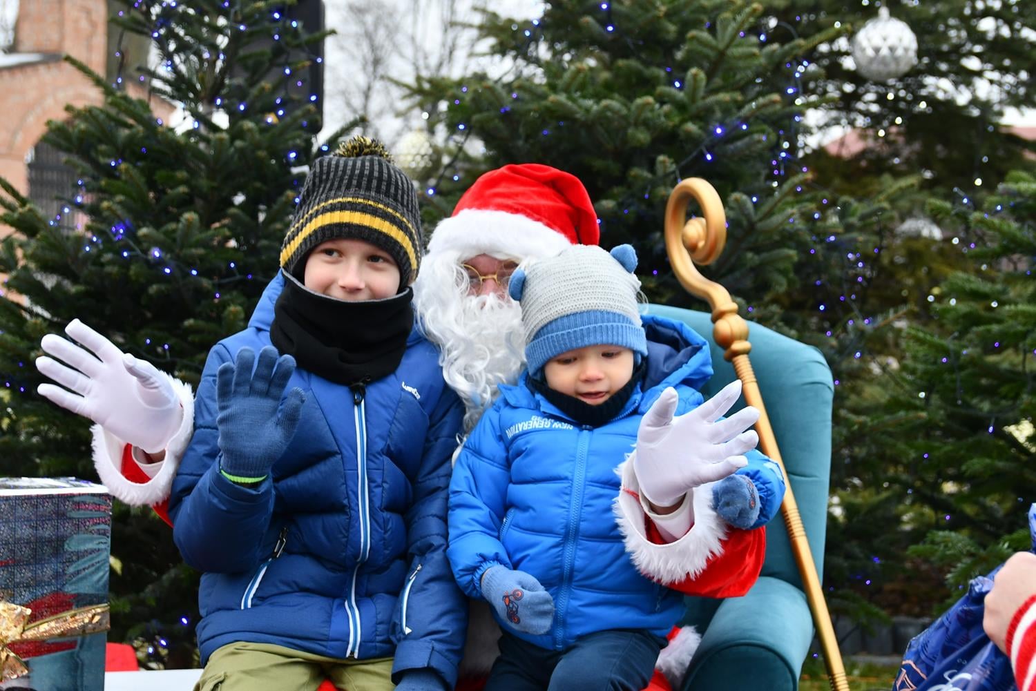 Przed przybyciem św. Mikołaja na placu przed ratuszem na choinkach rozbłysły lampki, a z głośników popłynęła świąteczna muzyka.