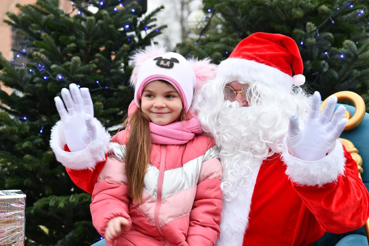 Przed przybyciem św. Mikołaja na placu przed ratuszem na choinkach rozbłysły lampki, a z głośników popłynęła świąteczna muzyka.