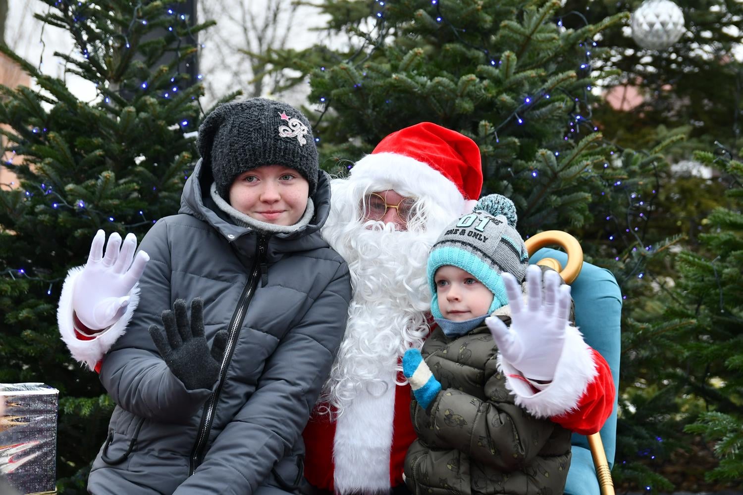 Przed przybyciem św. Mikołaja na placu przed ratuszem na choinkach rozbłysły lampki, a z głośników popłynęła świąteczna muzyka.