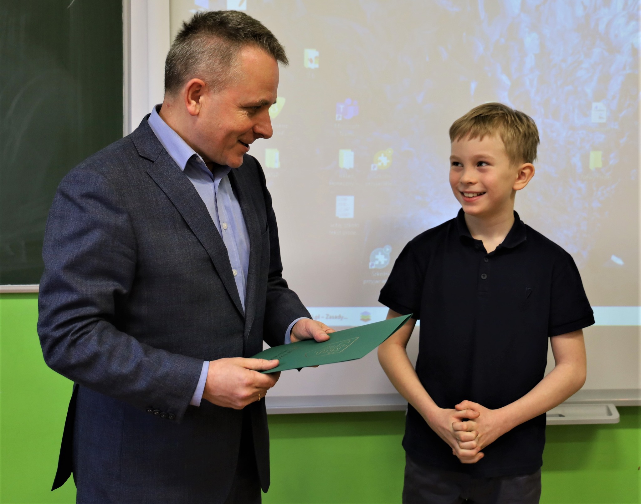 Małego bohatera odwiedzili burmistrz Jerzy Bauer oraz dyrektor Wydziału Oświaty, Dorota Ambroziak.