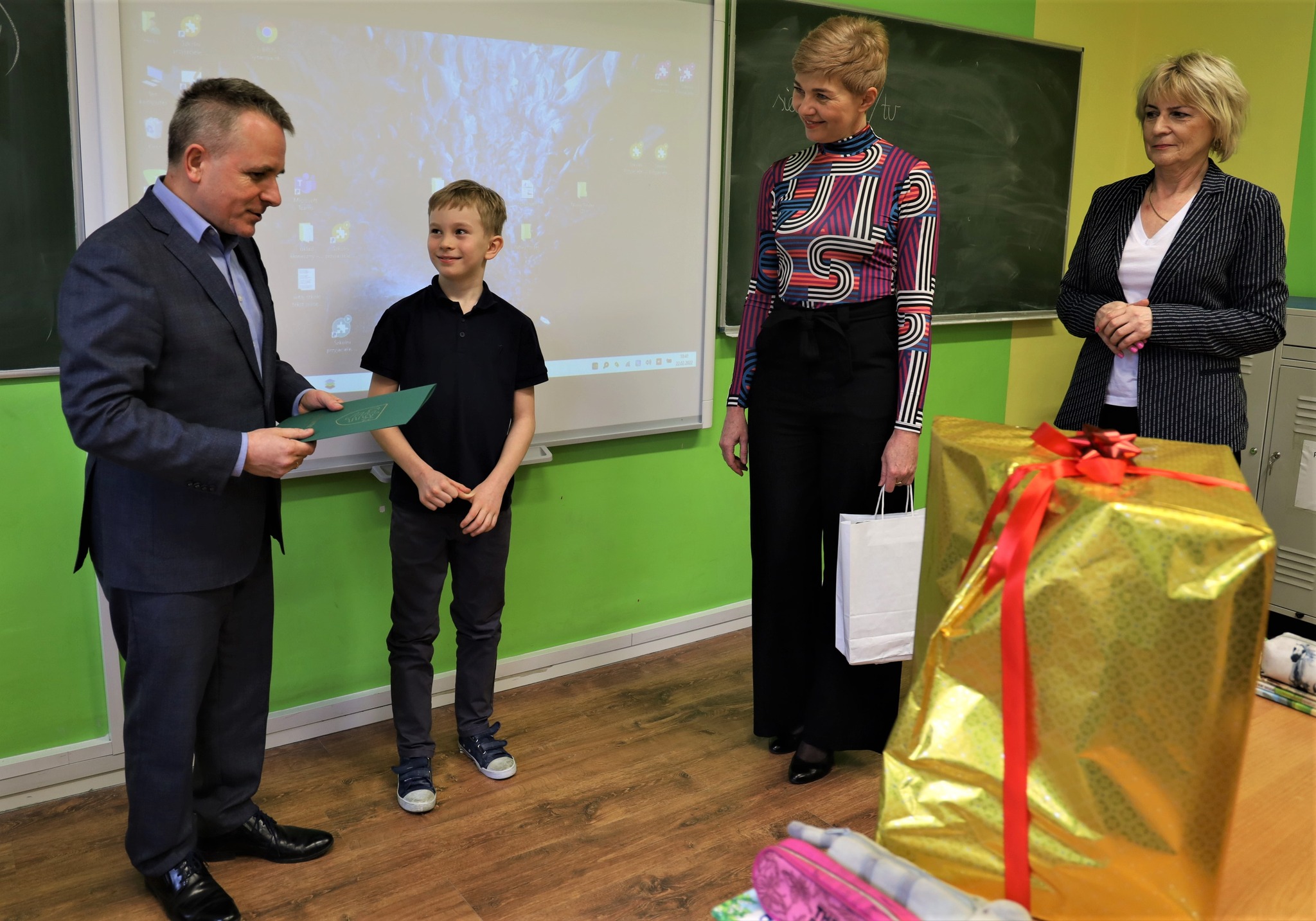 Małego bohatera odwiedzili burmistrz Jerzy Bauer oraz dyrektor Wydziału Oświaty, Dorota Ambroziak.